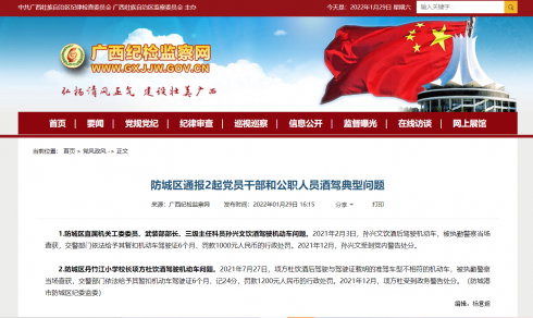 1.防城区直属机关工委委员、武装部部长、三级主任科员孙兴文饮酒驾驶机动车问题。 2021年2月3日,孙兴文饮酒后驾驶机动车,被执勤警察当场查获,交警部门依法给予其暂扣机动车驾驶证6个月、罚款1000元人民币的行政处罚。2021年12月,孙兴文受到党内警告处分...