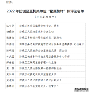 根据《中共防城港市防城区直属机关工作委员会印发关于大力推进新时代清廉机关建设的实施方案的通知》(防区直〔2022〕29号)精神,以及《关于报送清廉机关建设“勤廉榜样”有关...