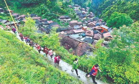 近年来,广西壮族自治区柳州市有针对性加强对年轻干部的实践锻炼,注重在基层一线和困难艰苦的地方培养锻炼年轻干部。图为柳州市鱼峰区委宣传部95后干部、融水苗族自治县杆洞乡党鸠村乡村振兴工作队队员带领村寨学生开展劳动活动,开展爱国主义教育。新华社...