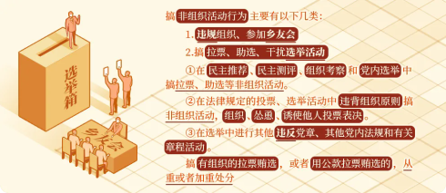 《中国共产党纪律处分条例》第八十二条、第八十三条对搞非组织活动行为列出负面清单,对违规组织、参加乡友会,以及搞拉票、助选、干扰选举活动作出处分规定。 1.违规组织、参...