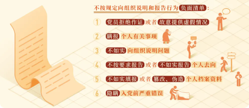 《中国共产党纪律处分条例》第八十条、八十一条,对不按规定向组织说明和报告行为作出了处分规定,主要包括6类: 1.党员拒绝作证或者故意提供虚假情况 《条例》第八十条规定,...