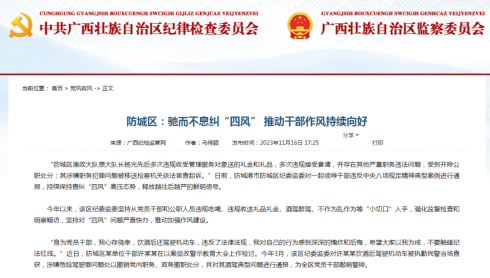 “防城区渔政大队原大队长杨光先后多次违规收受管理服务对象送的礼金和礼品,多次违规接受宴请,并存在其他严重职务违法问题,受到开除公职处分;其涉嫌职务犯罪问题被移送检...