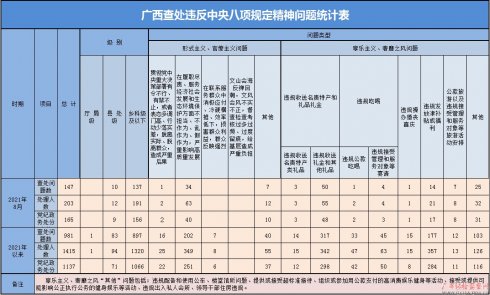 2021年1至9月,防城港市各级纪检监察机关共查处违反中央八项规定精神问题48起,处理56人,党纪政务处分46人。其中9月份,防城港各级纪检监察机关共查处违反中央八项规定精神问题5起,处理5人,党纪政务处分5人。数据显示,当月查处违规接受管理和服务对象等...