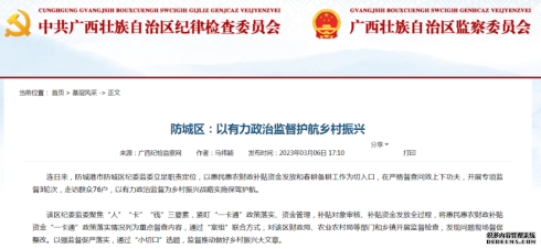 连日来,防城港市防城区纪委监委立足职责定位,以惠民惠农财政补贴资金发放和春耕备耕工作为切入口,在严格督查问效上下功夫,开展专项监督3轮次,走访群众76户,以有力政治监...