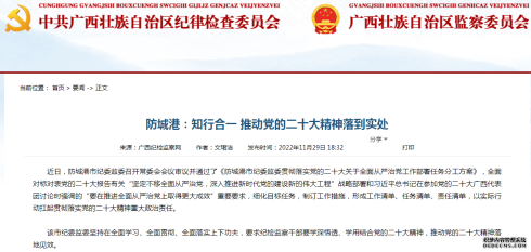 近日,防城港市纪委监委召开常委会会议审议并通过了《防城港市纪委监委贯彻落实党的二十大关于全面从严治党工作部署任务分工方案》,全面对标对表党的二十大报告有关“坚定不...