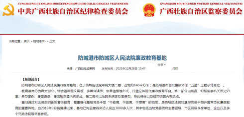 【基地简介】 防城港市防城区人民法院廉政教育基地,位于防城区法院审判大楼二楼,占地约140平方米,是防城港市首批廉洁文化“五进”工程示范点之一。 教育基地分为两大部分,...