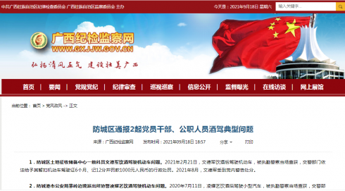 1.防城区土地征收储备中心一级科员文德军饮酒驾驶机动车问题。 2021年2月21日,文德军饮酒后驾驶机动车,被执勤警察当场查获,交警部门依法给予其暂扣机动车驾驶证6个月、记12分并罚款1000元人民币的行政处罚。2021年8月,文德军受到党内警告处分。 2.防城...