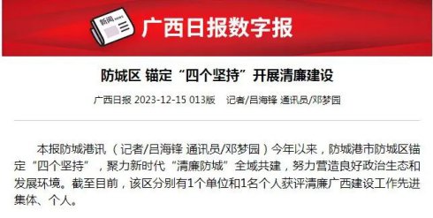 今年以来,防城港市防城区锚定“四个坚持”,聚力新时代“清廉防城”全域共建,努力营造良好政治生态和发展环境。截至目前,该区分别有1个单位和1名个人获评清廉广西建设工作...